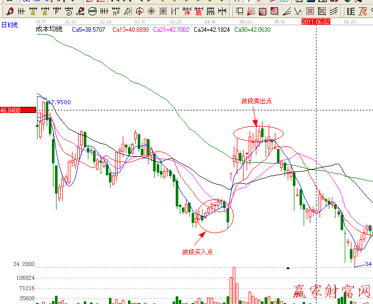 2.在下跌趨勢行情中做回調整理波段買賣操作時,回調整理波段買入點價位首選前期下跌低點,當股價觸及前期下跌低點,成交量增加,股價無法形成跌破時,則可進行買入操作,若股價形成跌破,則不適宜進行短線波段買賣操作。