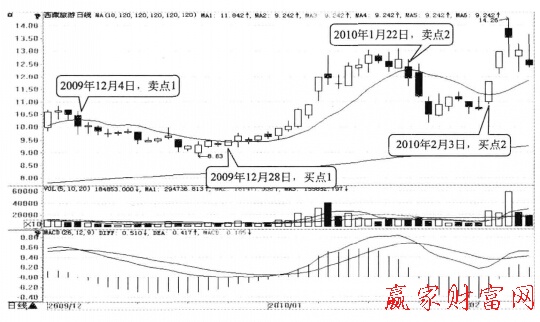 如圖所示,2009年12月4日,西截旅游股價快速下玫后雖然沒有玻破120日均線,但映破了10日均線。這個形態說明雖然長期來看股價仍處于牛市行情中,但短期將會下映。這是姐線賣出信號。此時投資者可以將手中的股票賣出。12月28日,股價突破了10日均線。這說明姐期下映行情結束。此時投資者可以將剛剛賣出的股票買回。通過這樣的高賣低買操作,投資者能夠成功進開這一段下映。