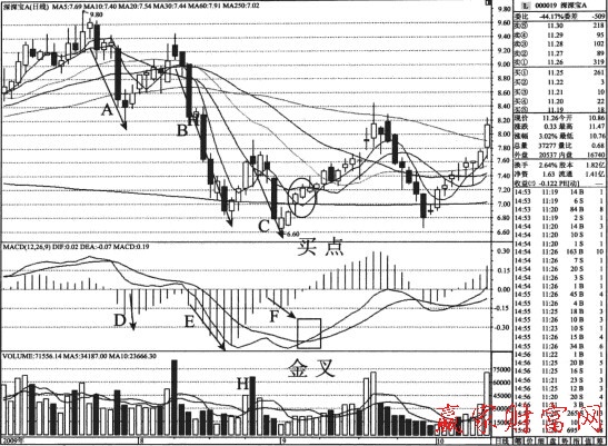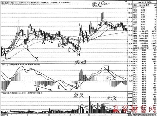 從上圖中可以看出,A、B、C三波下跌明顯,會有一波反彈。海正藥業(600267)公司不但經營正常,而且業績較好。C的低點已低于X點,在下跌過程中不是有支撐位就可以吃,而是破前期低點才可以買入。從MACD指標中的D、E、F三條直線看,三波下跌非常清晰可見。H點在低位放長量上漲,買點出現。
