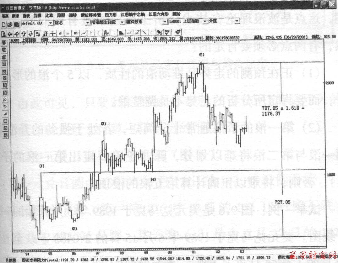 滬指由1994年7月的325 .89開始大浪(1)的上升,至1994年9月的1052.94高點結束。若以(1)浪升幅727.05點計,其1.618倍的幅度是1176.37。將1176.37加在(1)浪頂1052.94之上,其計算目標在2229.31,與實際(5)浪頂的高點2245.44只相差16.13點。16.13點相比325.89至2245.44整個5個浪的上升,差額只有0.84%(如下圖)。
