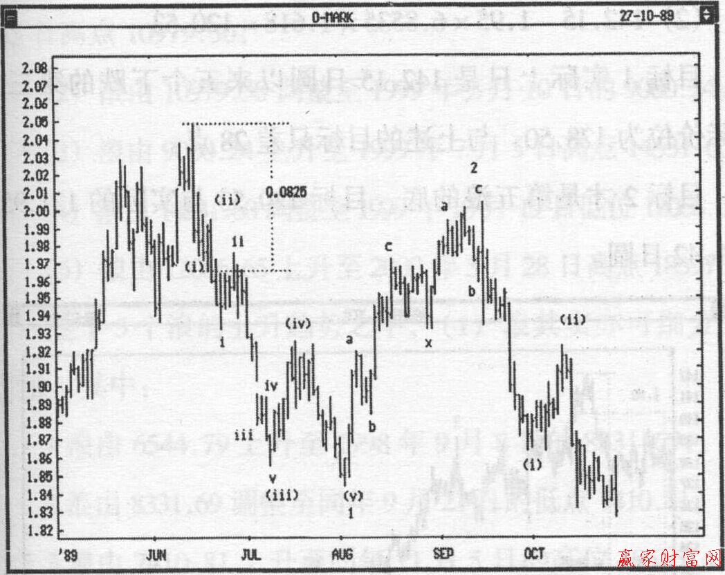 試舉一例:下圖是美元兌馬克于1989年5月開始的—段日線圖。美元兌馬克于1989年,6月15日的2.0480下跌至6月20日的1.9655馬克,下跌幅度為825點。