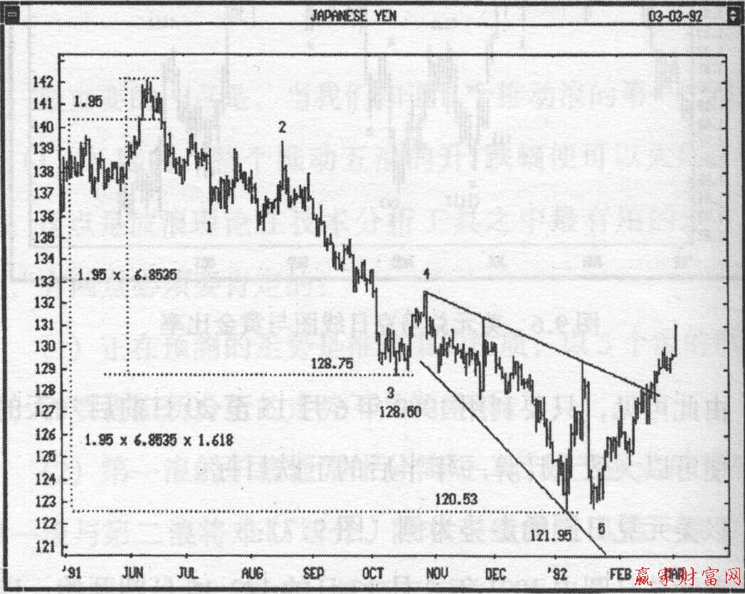 利用上述介紹的計算方法,這一組中期下跌浪的幅度應勾0.0825乘以6.8535,跌幅應為0.5654。由9月15日2.0480馬克開始計算,下跌目標應為1.4825。結果,美元兌馬克于1991年2月11日下跌至1.4430馬克,與目標相差約400點,或跌輻的7%。