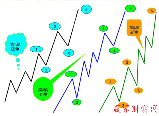 3、第5浪延伸具有特殊性:若第5浪延伸,則后面必然會出現調整三浪,并且,價格回落的位置是可以預測的。