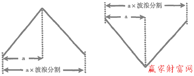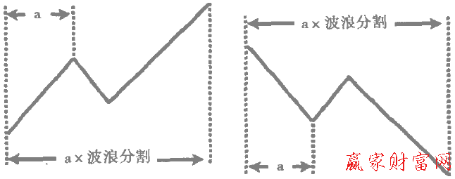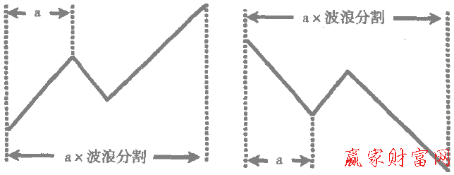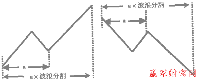 第三,一段趨勢的起點(diǎn)與其后相反趨勢的終點(diǎn)構(gòu)成的循環(huán)所經(jīng)歷的時(shí)間乘以波浪分割將會是其后一段趨勢的終點(diǎn)。如下圖所示。