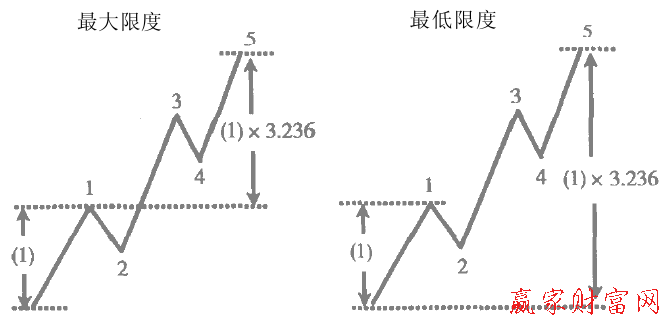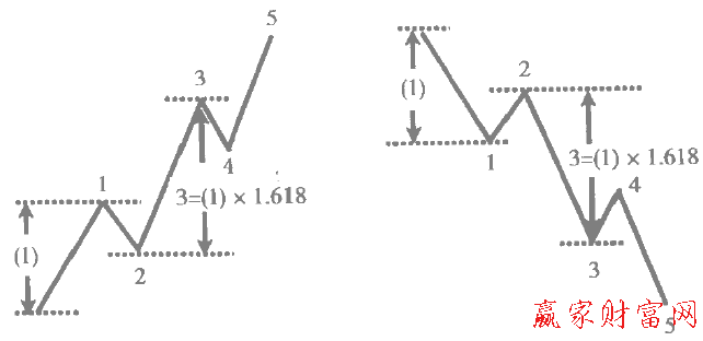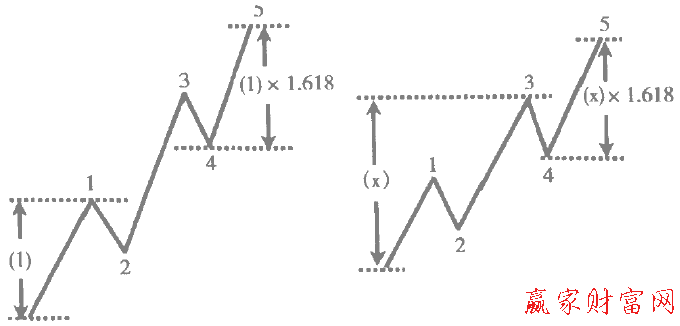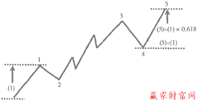 ③如果第1浪及第3浪幅度及運行時間相同,則第5浪幅度可以為第1浪幅度的1.618倍;或者第5浪頂可以為第1浪底至第3浪頂垂直距離的1.618倍,加上4浪低點。