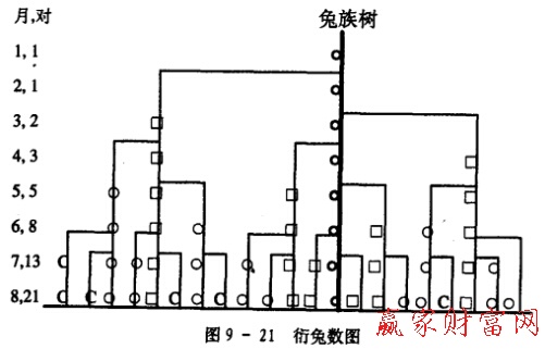 Fibonacci生于1170一1180年間.他在《算學》一書中提出當今稱為費氏級數的數列.該級數源于這樣一個問題:一對兔子在封閉環境下,假設從出生后第二個月開始每月每繁殖一對兔子,那么從這一對兔子開始,若干月之后會有多少兔子?答案見圖9一21中的兔族樹。