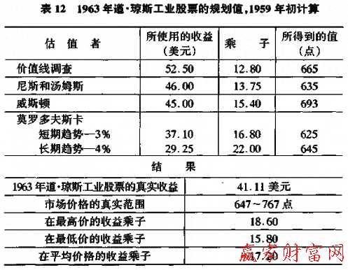 得到權威人士的允許,表11-2給出了一些他們對1964年道.瓊斯工業股票的估價數據。在每個情況下,1964年的數據都比用老的準則得到的相應數據高出許多,但仍比當年的實際數據低一些。我們用修改過的中心價值方法得到的結果顯示:用老方法得到的結果至少有50%的偏差。