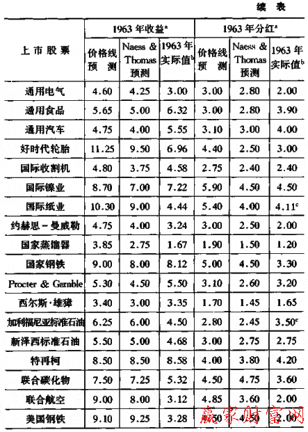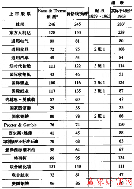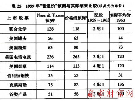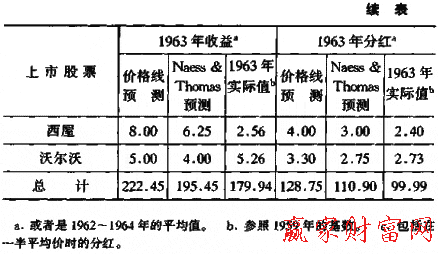 在表25和表26中,列出了1959年所作的評價。這是基于1963年或1962年至1964年的情況作出的,并且還列出了1963年的實際結(jié)果。在第3章,我們曾經(jīng)討論了這些預(yù)測中的收益和分紅的比例,表明它們在總價中的比例過高;相反,價值或價格的預(yù)測與1963年的實際平均價格相比有下墜的趨勢,并且在1963年和1964年低于最高水平。