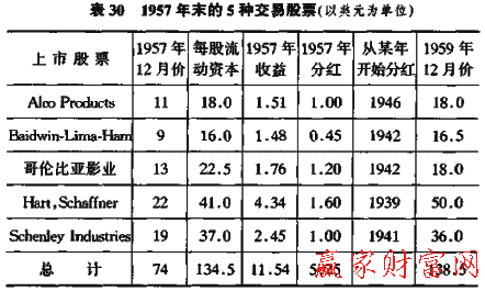 為了說明在有吸引力的水平上的次等普通股的選擇,我們將回到1957年的年末。在表30中,列出了在那里滿足以下4條投資價值標準的5種股票。