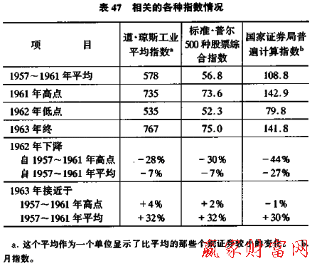 在表47中我增加了資料,以比較標(biāo)準(zhǔn).普爾公司的500種股票綜合指數(shù)與按月提供的以35種未上市股票為基礎(chǔ)的國家證券局工業(yè)平均指數(shù)所反映的市場(chǎng)價(jià)格變化。我們將注意到標(biāo)準(zhǔn).普爾股票比道.瓊斯30種工業(yè)股票運(yùn)行得好,并且第三市場(chǎng)指數(shù)也運(yùn)行得好。在1951年至1960年,開始時(shí)以100美元購買超過1000種紐約證券交易所的股票并持有它一直到期末的結(jié)果,與購買道.瓊斯工業(yè)股票的指數(shù)相類似(這個(gè)事實(shí)被芝加哥大學(xué)的研究所證實(shí))。這些數(shù)字似乎與我的隨機(jī)案例的指示相矛盾,該指示認(rèn)為單體組合的質(zhì)量越高,所期待的結(jié)果就越好。