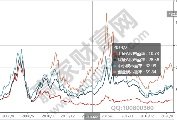在A股市場中,使用平均市盈率來看市場,包含深圳成指的平均市盈率、 創業板指數市盈率、全市場平均市盈率、 中小板指數市盈率、上證指數的平均市盈率。