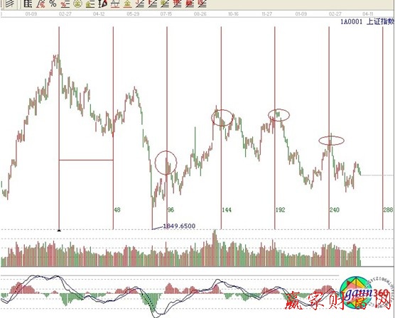 在證券市場(chǎng)分析當(dāng)中,大家用慣了黃金時(shí)間周期線和費(fèi)氏時(shí)間周期線線,往往忽略了最簡(jiǎn)單的時(shí)間工具,那就是等等距時(shí)間周期線。在江恩理論中,江恩認(rèn)為,市場(chǎng)的底部和頂部都是根據(jù)周期的規(guī)律而得來(lái)的。市場(chǎng)的價(jià)格和走勢(shì)的形態(tài)也是根據(jù)時(shí)間周期的變化而重復(fù)出現(xiàn)的。等距時(shí)間周期形成的原因是因?yàn)樗總€(gè)循環(huán)周期都是相同相等的,看似簡(jiǎn)單的工具,蘊(yùn)含著巨大的作用,相同的時(shí)間產(chǎn)生相同的結(jié)果,大道至簡(jiǎn)我相信也就如此了。