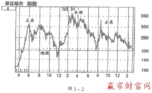 頭肩式殺傷力極大,上圖是深圳幾年波動中形成的頭肩圖,它使起初靠原始股起家的大戶被無情消滅。