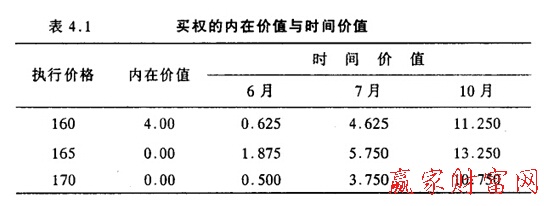 通常美式期權(quán)的價(jià)格大于其內(nèi)在價(jià)值,其間的價(jià)差就是時(shí)間價(jià)值(Time Value),或稱投機(jī)價(jià)值(孫eculative Value)。它等于C. (S, T, E)一Max (0, S一E)。時(shí)間價(jià)值反映T投資者愿意為標(biāo)的資產(chǎn)的價(jià)格的未來的不確定性支付代價(jià)。表4.1表示的是一買權(quán)的內(nèi)在價(jià)值和時(shí)間價(jià)值,可見,時(shí)間價(jià)值隨到期時(shí)間的增長(zhǎng)而增長(zhǎng)。