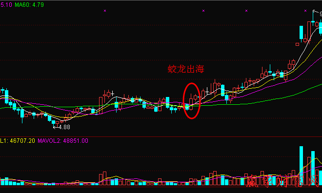此信號(hào)一般出現(xiàn)在下跌后期或盤整期,一根陽(yáng)線拔地而起,一下子把短期,中期,長(zhǎng)期均線吞吃,收盤價(jià)已收在這幾根均線之上。這是一種反轉(zhuǎn)信號(hào),后市看好。激進(jìn)者可大膽跟進(jìn)。陽(yáng)線的實(shí)體越大,信號(hào)越真實(shí)可靠,同時(shí)需要有成交量放大的支持。