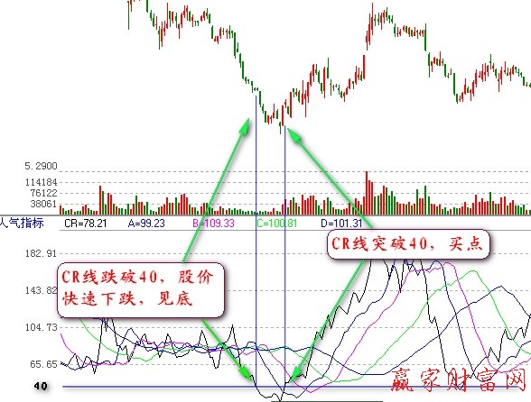 第一種買入方法:CR線在40以下,當(dāng)CR線向上突破40時(shí)買入股票