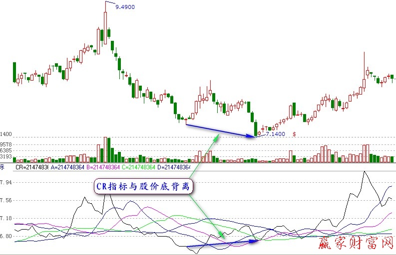 當(dāng)股價(jià)持續(xù)下跌、連續(xù)創(chuàng)出新低時(shí),如果CR指標(biāo)的CR線沒有創(chuàng)新低,反而是形成一底比一底高的形態(tài),這就與股價(jià)形成了底背離。