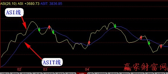 該指標中的ASI線是以開盤價、最高價、最低價、收盤價為基礎計算出的一條曲線。該指標的波動幾乎與對應股價或指數同步,因此,投資者可以將該指標看作是股價走向的領先指標來判斷股價的走向。而ASIT線則是ASI線的移動平均線,投資者可將其作為ASI線的輔助指標使用。