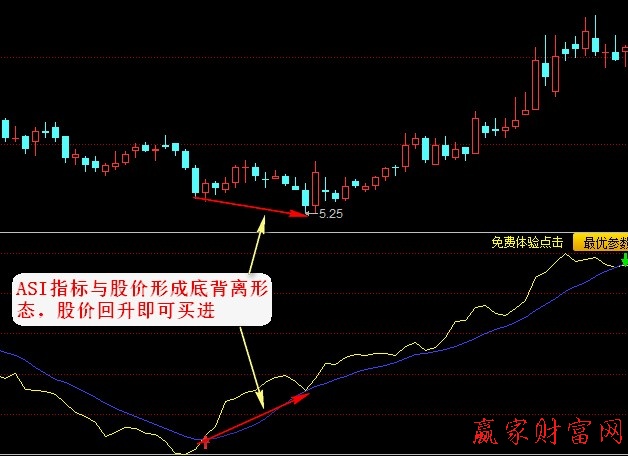 股價在經過一段時間的下跌后,股價價位已經很低,而且股價連續下跌,不斷創出新低,而此時ASI指標卻是開始回升,反而是一波比一波高,與股價形成底部背離形態。