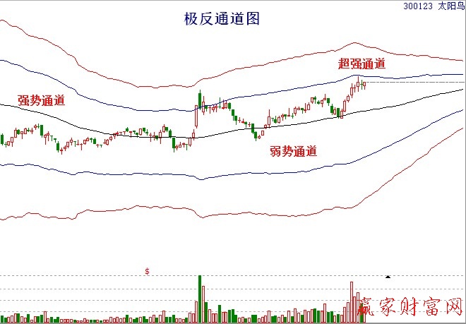 極反通道。我們從軟件上調出太陽鳥的極反通道圖,如下所示??梢园l現該股目前處于極反通道生命線上方的強勢通道中,因此,符合操作強勢股的要求,也就是說該股的趨勢符合買入要求。