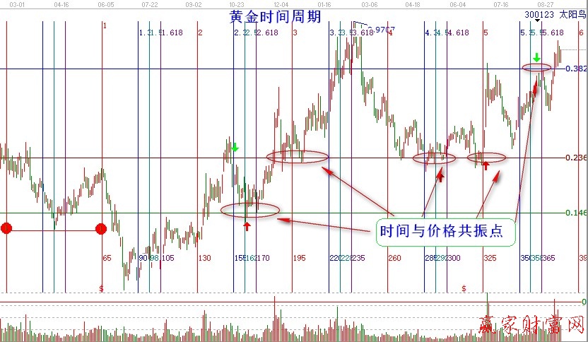 黃金時間周期線,以2013年2月18日為起點,以2013年5月3日為終點的這個區間為一個完整的周期,并做出時間線,如下圖(為了方便看圖,其中插有價格分析)??梢园l現該股的下個時間窗口為9月26日。