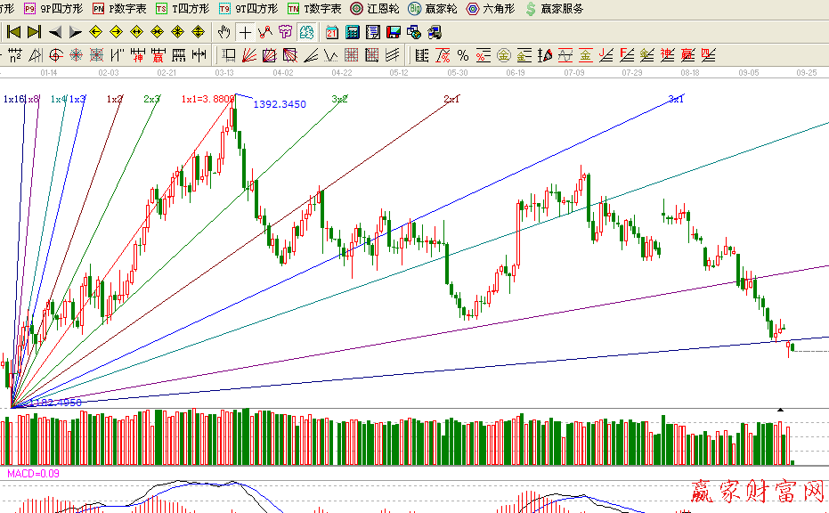 2.市場(chǎng)經(jīng)過(guò)多次突破之后,最后會(huì)在某一條角度線終止現(xiàn)有趨勢(shì),并發(fā)起新一輪與之前相反的趨勢(shì)。
