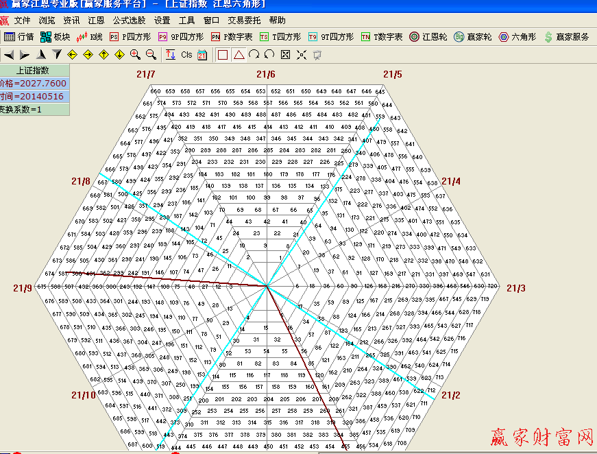 六角形中的數(shù)字代表市場(chǎng)的價(jià)位,當(dāng)市場(chǎng)中的價(jià)位到達(dá)江恩六邊形某一重要角度線時(shí),就會(huì)出現(xiàn)支持力或阻力,如0度和180度等。