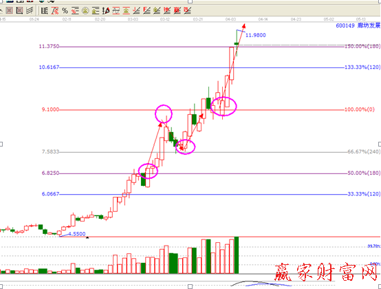 1、首先我們可以看到600149這波拉升是從2014年2月7號(hào)開始的,那我們就以這一天的低點(diǎn)4.55為起點(diǎn),畫江恩百分比線。