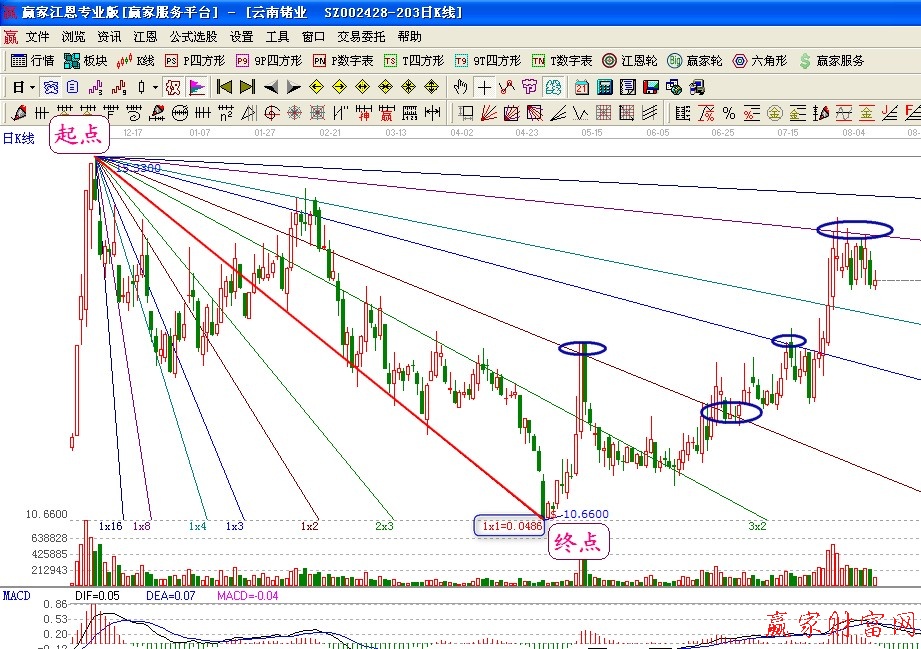 同樣我們也可以畫一個更復雜的江恩角度線,我們都知道股價從高點跌至低點我們可以畫一個向下的江恩角度線,那么他在反彈后的第一個高點,我們同樣也可以畫一個向上的角度線。