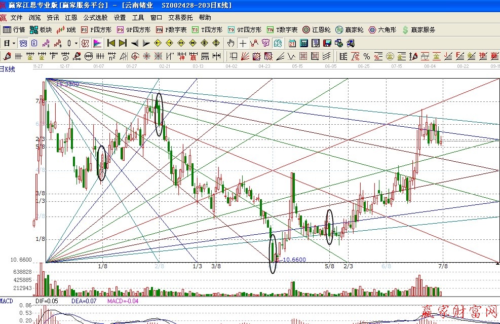 通過這兩個,我想大家也明白了,江恩箱沒有一個明確的畫法。也不會像趨勢線、黃金分割那樣有一個固定的模式讓你去套用。江恩箱是非常靈活的一種畫線工具。需要股友們長期的實踐和測試,還需要多觀察多修正,這樣才能畫出一副完美的江恩箱。