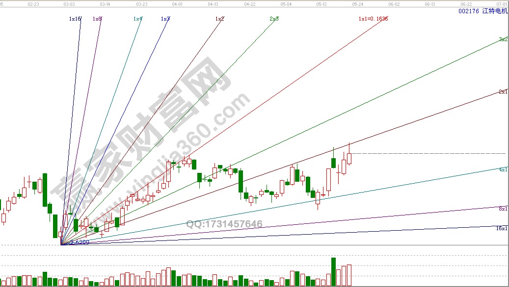 我曾經多次提到結構一詞,這正是研究江恩理論需要重點解決的問題,我們在讀江恩理論的書籍時候,尤其是初次接觸,他的那些個理論,模型,圖形,讓人感覺摸不著頭腦,更不用說在股票的k線分析上結合使用了。其實江恩理論里面的最重要的一個概念是結構,理解了結構你對江恩理論才能豁然開朗,當然這些個結構絕對不是雜亂無章的,結構是時間和價格的函數,結構有時間的結構,價格的結構,時價的結構,也可以說是趨勢的結構。我認為江恩理論里面最典型的角度線分析工具,就是分析趨勢結構的,什么是趨勢,我們先看看物理學上力的表示:大小方向作用點,在角度線工具里面,也有這三個要素,他們可以說是一模一樣的,我們在市場上習慣用趨勢這個詞,但是趨勢究竟是什么,其實趨勢首先包含了方向,其次是大小,也就是力度,還有趨勢的轉折點,趨勢既然包含了方向和大小,那么就和物理學上的力的分解一樣,分解的結果就是水平方向上一個垂直方向上一個,正應了江恩所說的那句話:時間和價格相互轉換,趨勢不是價格也不是時間,趨勢卻包含了價格也包含了時間,對趨勢進行分析的工具就是角度線,所以角度線就是趨勢2(3)分法的應用,這就是角度線能夠描述市場的本質所在。
