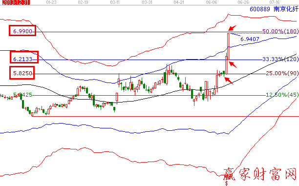 上圖中加有極反通道,可以看出首先此股票在生命線上,屬于強勢股票,可以操作。之后根據百分比找買點,當然最安全的買點還是生命線位置;之后我們可以看出,在6月13日股票后來就回回調支撐,就是逢低買的買點,之后第二天獲得支撐就有一個快速的拉升,并突破上方壓力6.2133,以此為支撐繼續向上拉升。至于之后的走勢就要提高止損位至藍色外軌線支撐,而壓力位就是上方壓力6.99。