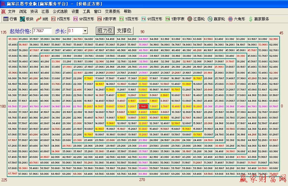 其中,這些價格都是對角線和十字線上的價格,小編在這里列舉了逆時針循環五圈的價格,后面的價格可以從圖中看出也可以聯系客服一起學習更多江恩理論的知識。