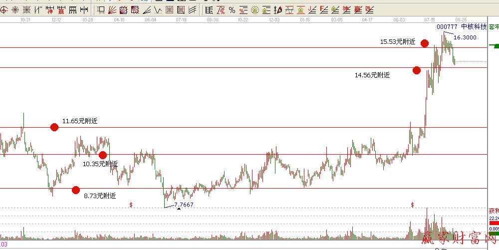 下圖是000777k線圖,其中在圖中標注了比較重要的突破位置水平線。其中第一條線上價格8.73元附近和四方形上0度位置的8.7667元很接近,第二條線的10.35元與10.4667元附近很接近,第三條水平線的11.65元附近與180度位置的11.6667元很接近,第四條水平線上的14.56元附近與180度位置的14.5667很接近,第五條水平線上的15.53元附近與315度位置上的15.7667元很接近,這就可以說明,在000777的k線圖形中,重要的平臺突破的位置都在四方形中出現,投資者只要在四方形中逆時針旋轉找到與當前價格相近的數值進行分析即可。