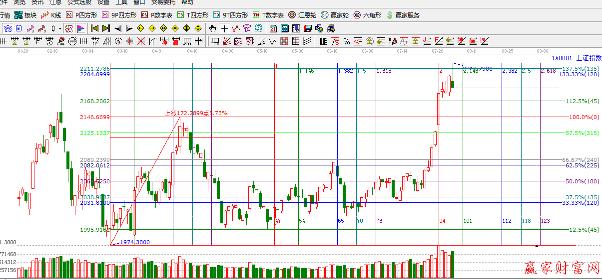 江恩看盤綜述:依據贏家江恩技術工具分析得出:周五指數在極反通道外軌阻力線遇阻回落,收倒垂頭線,量能同比放大,預計大盤短期將小幅下探,下方強支撐是江恩45度2168點,整體看多趨勢不變,操作上,合理控制倉位,做好高拋低吸。