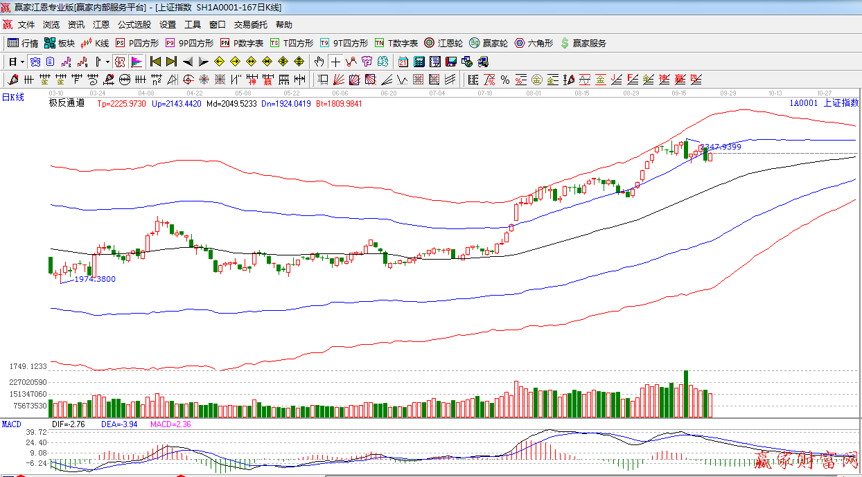 ★依據贏家江恩系統極反通道提示:縮量反抽極反通道藍色外軌線 ,阻力2318點,明日繼續關注此位置,短線看空,中線看多。