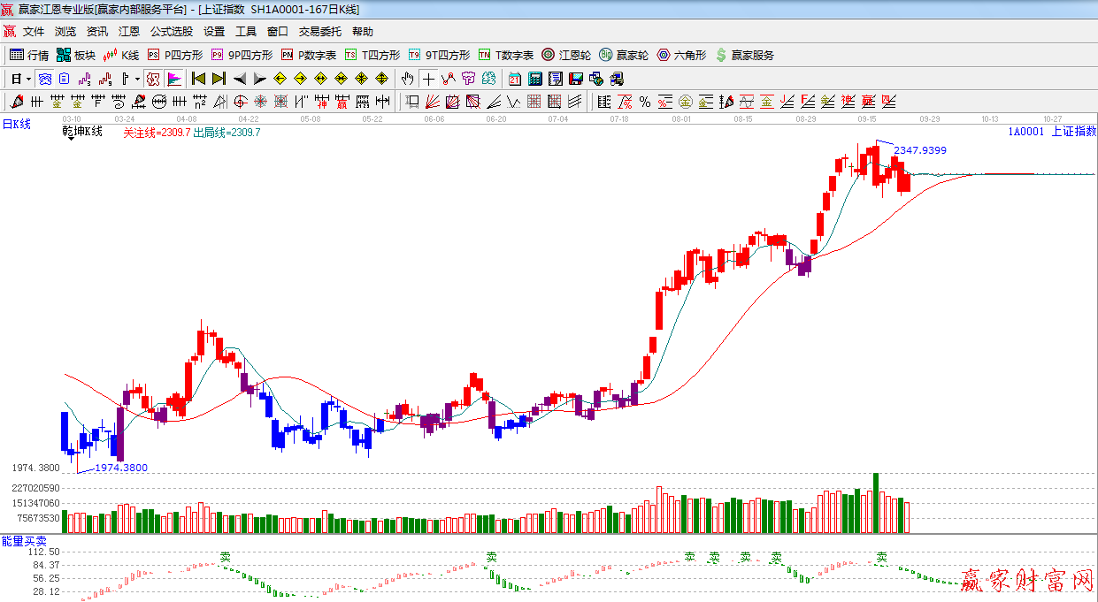☆依據贏家江恩系統能量買賣提示:“賣”字提 示,綠色看空能量柱加長,短線看空。