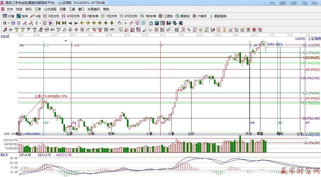 ☆依據贏家江恩系統黃金時間周期線提示:10月9日以及寒露時間節點之后,指數重心下移,短期可能將要調整幾天了,下一時間窗口10月22日。