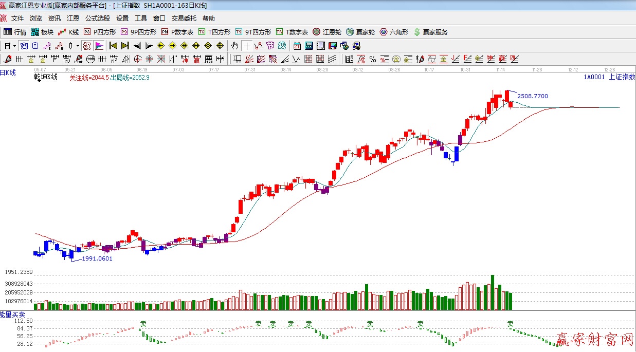 江恩看盤(pán)綜述:依據(jù)贏家江恩技術(shù)工具分析得出:昨日指數(shù)破位180度后,今日如期震蕩下行,11月11日的天量壓力需更時(shí)間來(lái)消化,所以短期市場(chǎng)震蕩調(diào)整走勢(shì)有望延續(xù),下方調(diào)整短期目標(biāo)位是江恩120度2410點(diǎn)或10月高點(diǎn)2391點(diǎn)。操作上,可適當(dāng)關(guān)注滬港通標(biāo)的稀缺性品種,比如中藥、白酒、軍工、以及重組題材股。