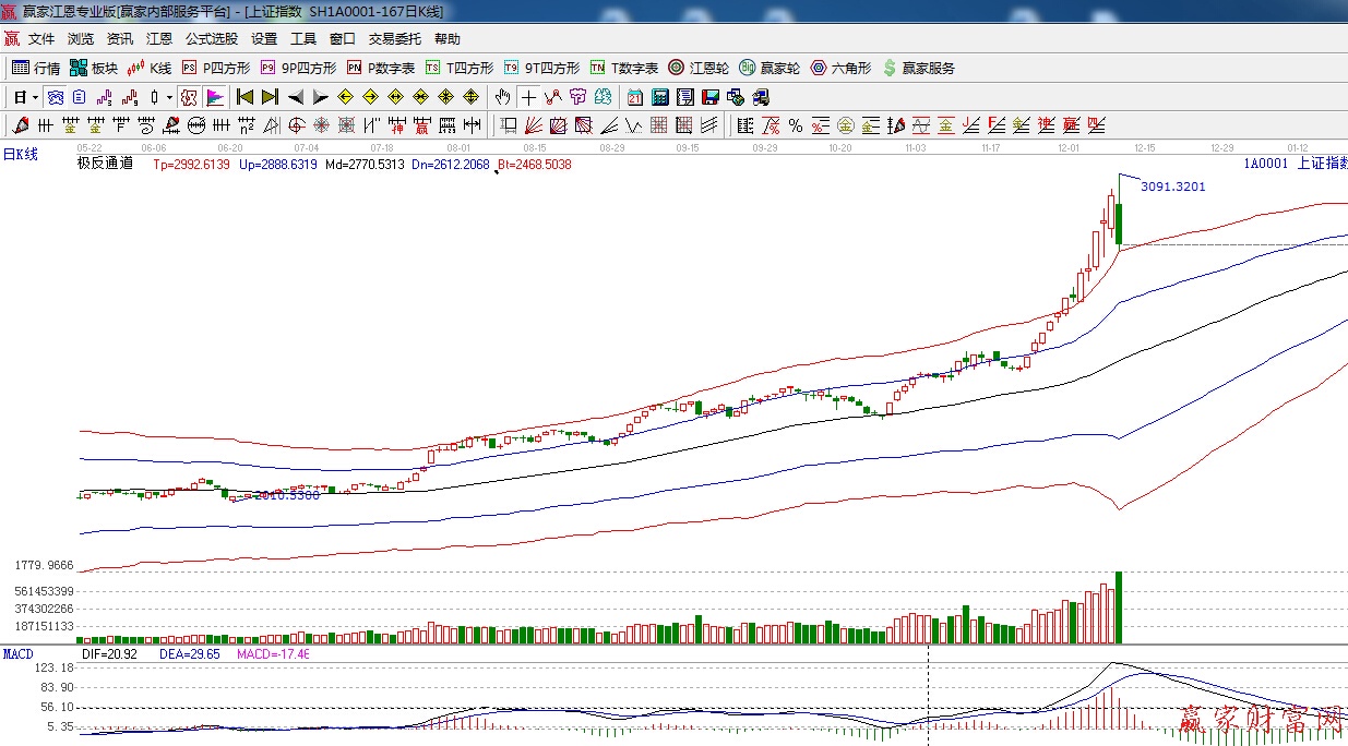 盤面上,幾乎所有版塊下跌,保險板塊下跌超9。7%居首,衛星導航、銀行、中石化系、航天航空等板塊 跌幅靠前,全天23家漲停,跌停近200家,今日指數如期在昨日分析到的阻力區間出現巨大獲利盤打壓, 加之融資融券與股指期貨的共振,市場產生了巨幅震蕩,不過面對近期爆炸性的量能,階段性的回調不 至于影響整體的上行趨勢,當前巨震正釋放了主力盤中清洗浮籌的信號
