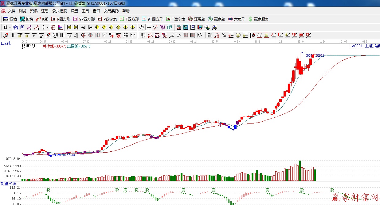 ★依據贏家江恩系統(tǒng)乾坤K線提示:紅色區(qū)域,綠色出局線之上,趨勢看多