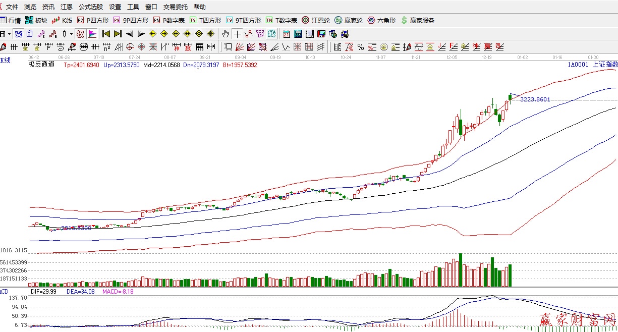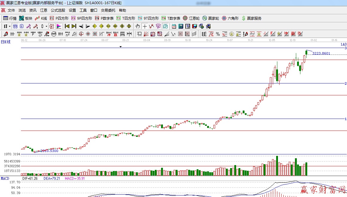 周一早盤滬指高開近2%,在保險(xiǎn)、地產(chǎn)、銀行、一帶一路等板塊帶動(dòng)下最高沖擊3223.86點(diǎn),創(chuàng)出近五年新高,臨近尾盤,隨著權(quán)重板塊的回落指數(shù)一度翻綠,創(chuàng)業(yè)板指數(shù)低開低走最大跌近50點(diǎn),破1500點(diǎn)關(guān)口,盤面上,保險(xiǎn)、地產(chǎn)、廣東自貿(mào)、白酒等漲幅居前,智能家居、送轉(zhuǎn)潛力、計(jì)算機(jī)應(yīng)用、網(wǎng)絡(luò)完全、互聯(lián)網(wǎng)金融等跌幅居前,技術(shù)面,早盤滬指沖高回落,尾盤回踩江恩0度支撐位回升,量能方面呈量價(jià)背離形態(tài),明日繼續(xù)關(guān)注江恩0度3114點(diǎn)支撐,此位置不破,短期上升趨勢不變,破位短線看空,預(yù)計(jì)短期指數(shù)高位震蕩為主,操作上已不宜盲目追高。