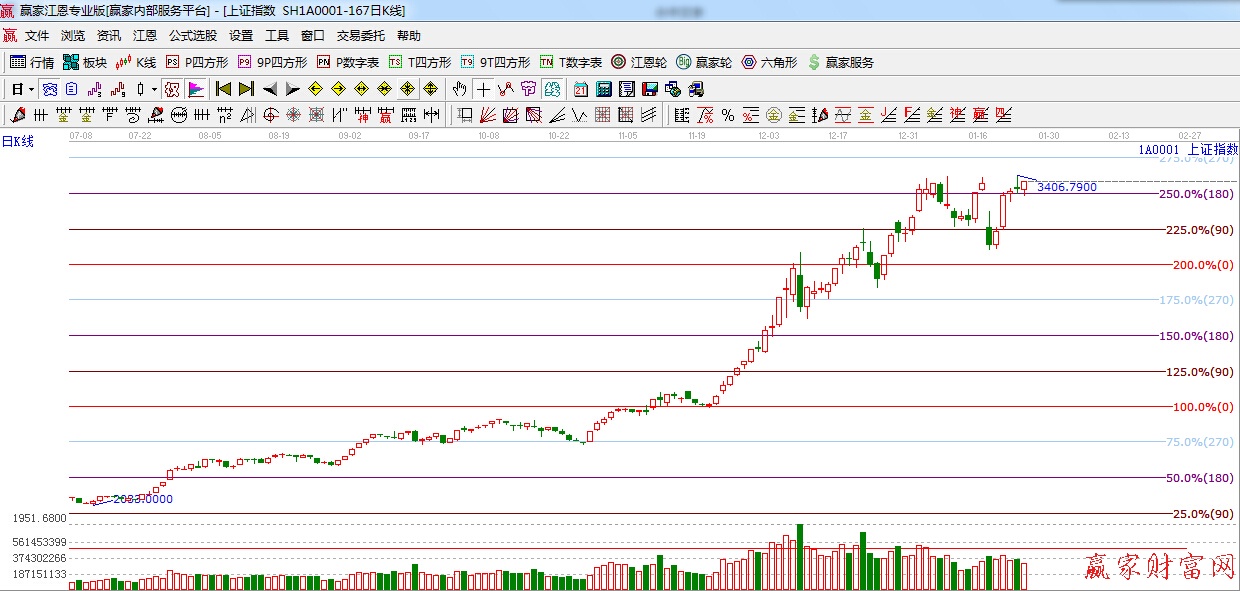 ★依據(jù)贏家江恩理論系統(tǒng)波段百分比提示:早盤滬指回探江恩180度支撐后,震蕩上行,180度3337點(diǎn)此位置不破繼續(xù)看多,上方目標(biāo)位江恩270度3486點(diǎn)。