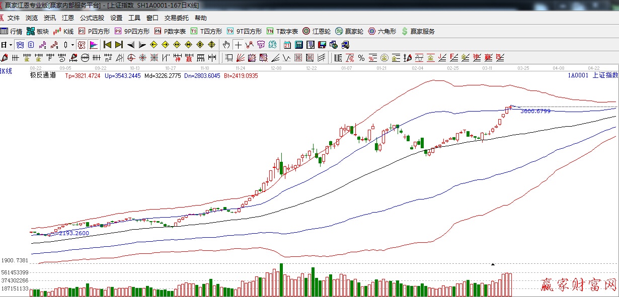 極反通道提示:今日在極反通道藍色外軌線之上維持震蕩走勢,終盤十字星報收,外軌線支撐不破,繼續看多。