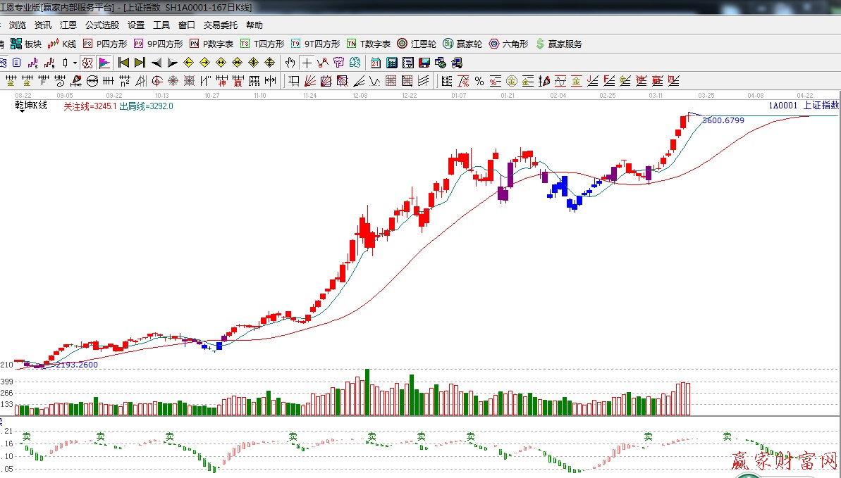 ★依據贏家江恩理論系統乾坤K線提示:紅色k線,可操作區域,趨勢看多。