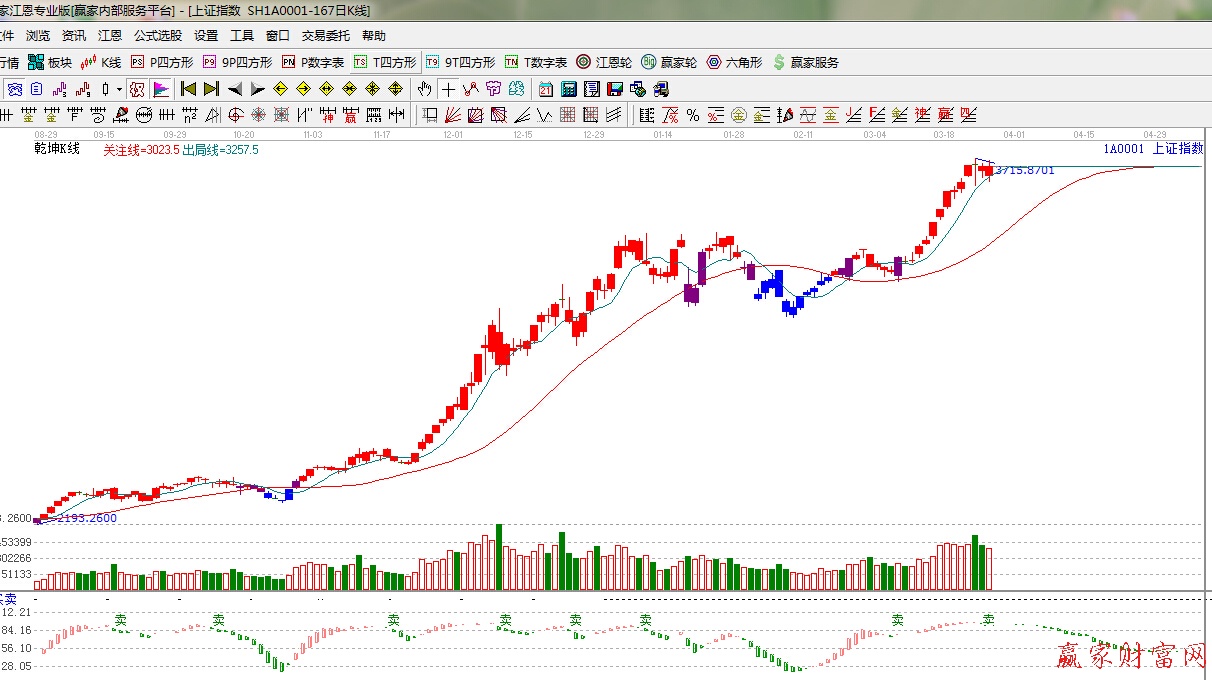 ★依據贏家江恩理論系統乾坤K線提示:紅色k線,關注綠色關注線的得失,