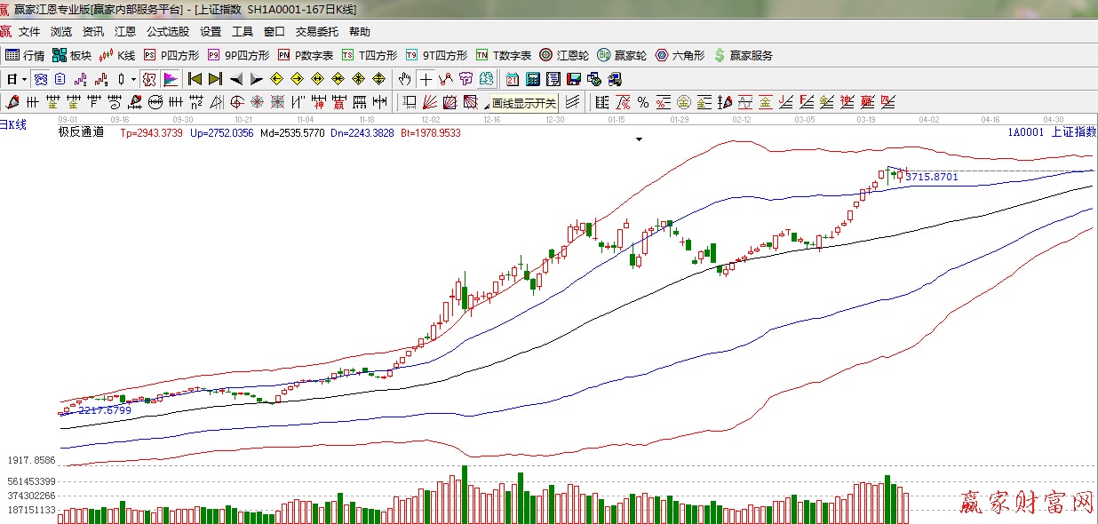 極反通道提示:滬指依然處于藍色外軌線上方震蕩整理,以消化近期獲利盤,依據(jù)規(guī)則,外軌線不破,看多。