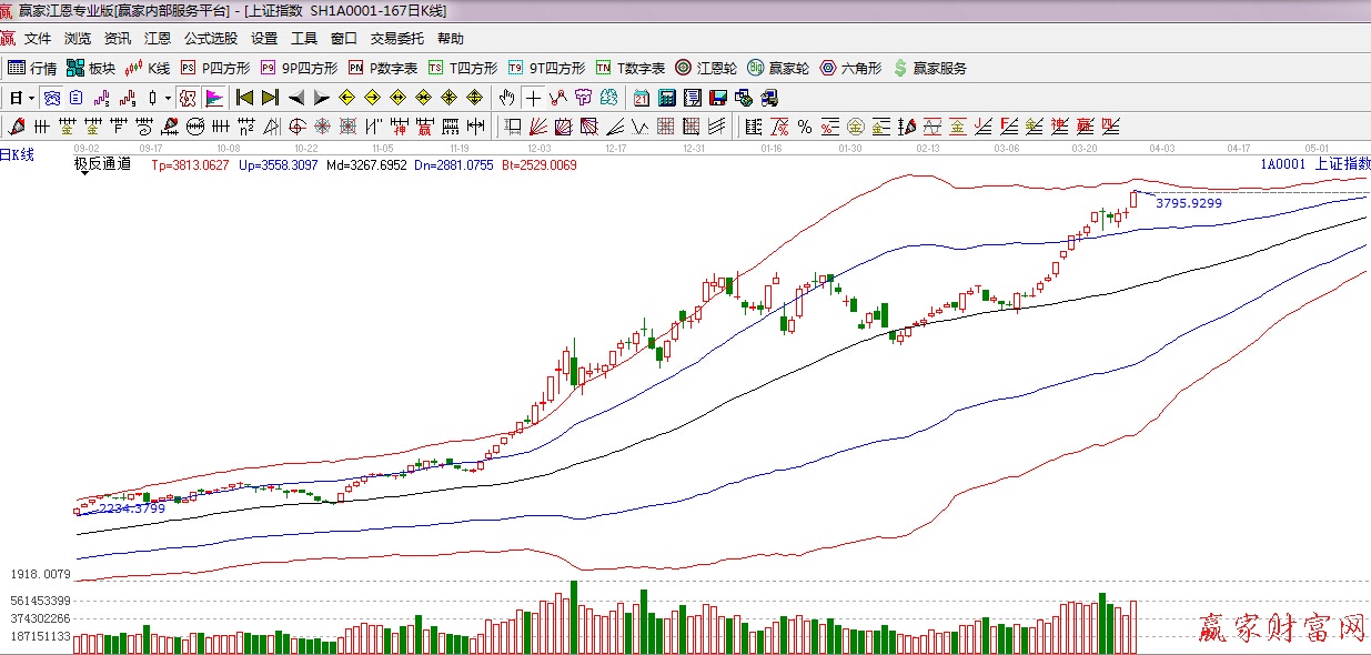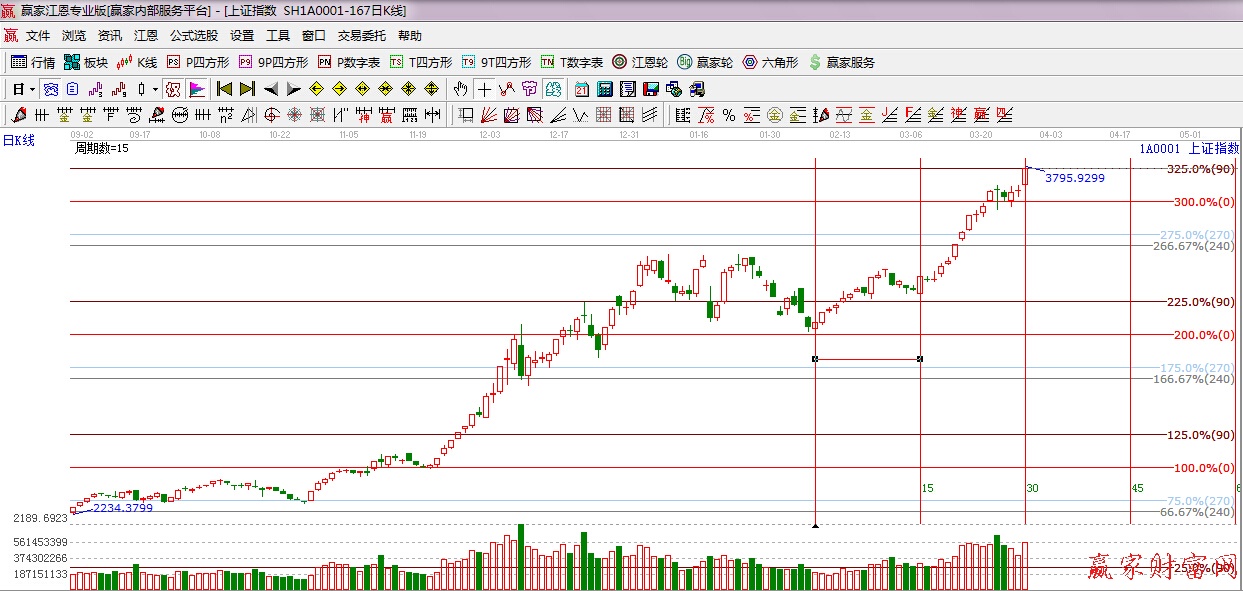 江恩看盤綜述:依據(jù)贏家江恩技術(shù)工具分析得出:近期指數(shù)圍繞江恩0度位置整理,30日是前期提到的時間窗口,滬指如期再次走強(qiáng),向上攻擊并突破江恩90度位置3783點,創(chuàng)7年新高,總體來看,市場整體強(qiáng)勢不改,依據(jù)工具分析,由于上行靠近極反通道紅色外軌阻力線,后期繼續(xù)上行可逐步控制倉位。操作上,繼續(xù)布局滯漲品種以及年報超預(yù)期的個股,對于短線急漲的個股要控制好倉位。