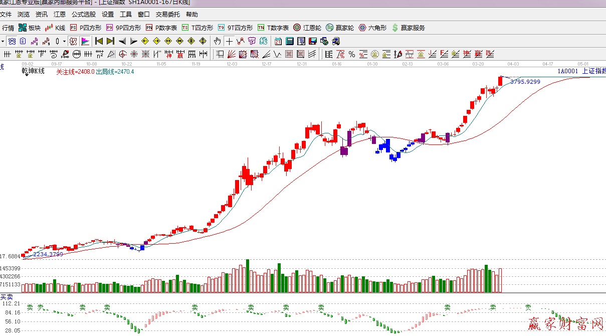 ★依據(jù)贏家江恩理論系統(tǒng)乾坤K線提示:紅色k線,綠色線上方,繼續(xù)看多。