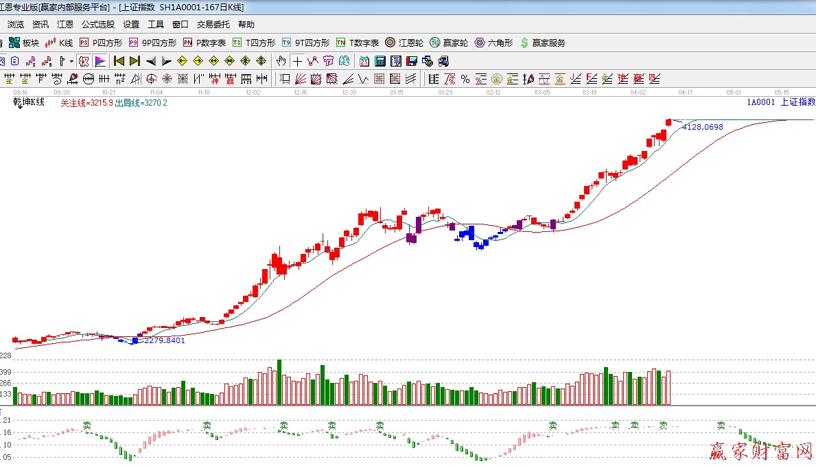 ★依據(jù)贏家江恩理論系統(tǒng)波段百分比提示:今日滬深兩市跳空突破江恩120度4082點(diǎn),下一目標(biāo)位是135度4157點(diǎn)附近。